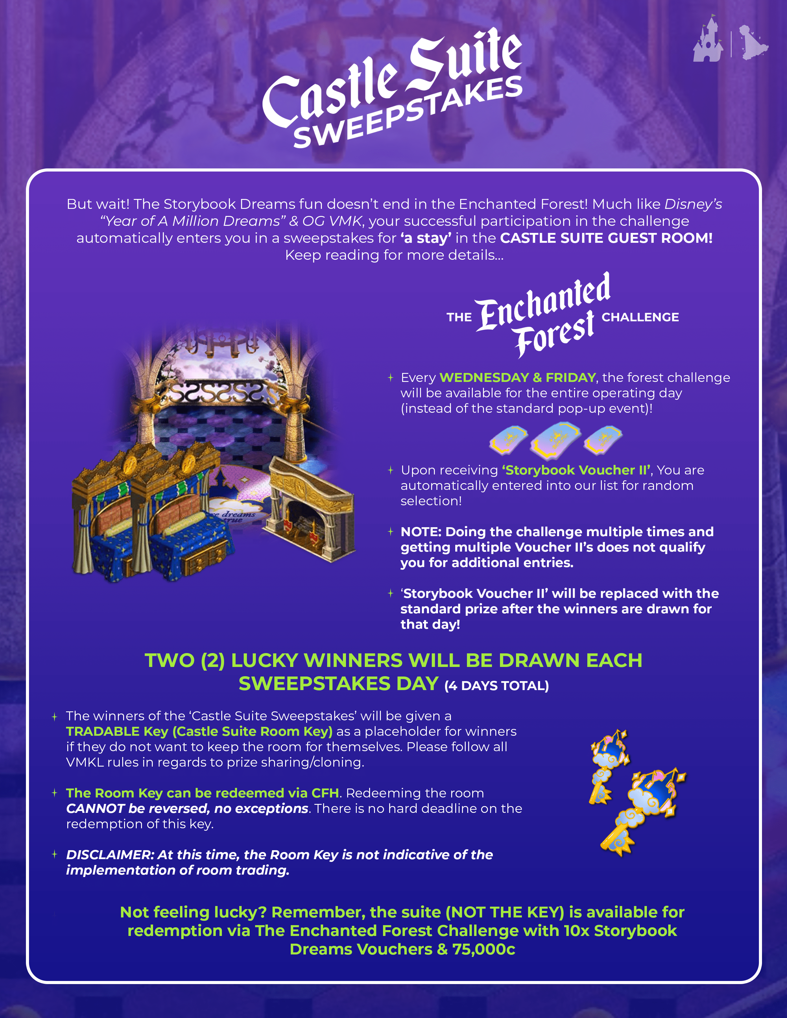 - 'Redeeming/Buying' the Castle Suite does not disqualify you from the Sweepstakes or vice versa. (i.e: if you're lucky you can win the Sweepstakes one day and also redeem your own room by the end)