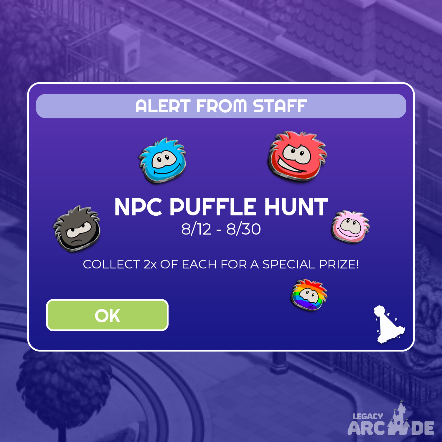 Captain Rockhopper and his trusty sidekick Yarr, have dropped off a load of goodies for us here at VMKL! He visited each NPC and gave them special Puffle Pins to give away each day, from today (8/12) through the game's close on 8/30. These pins will be able to be traded amongst the community! Stay tuned for Pin Trading events with Staff that will be added to the website and Discord server. To trade with Staff, players must have two (2) of each colored Puffle Pin to trade in for a special prize (the elusive Rainbow Puffle Pin!) Puffle Pins will not expire at the end of the festival, if you choose not to trade in your pins for the Rainbow Puffle Pin, you will be able to keep the other Puffle Pins you collected.