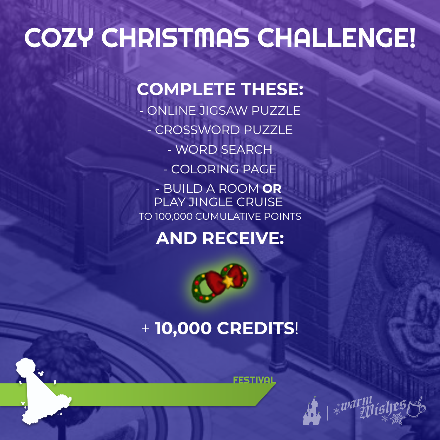 Who's ready for a little cozy Christmas fun and puzzling?? Complete the all of the Cozy Christmas Challenge tasks by 11:59pm EST on 12/18 and win 10k credits and Christmas Tree Minnie Ears! Head on over to the Discord to grab all the details.